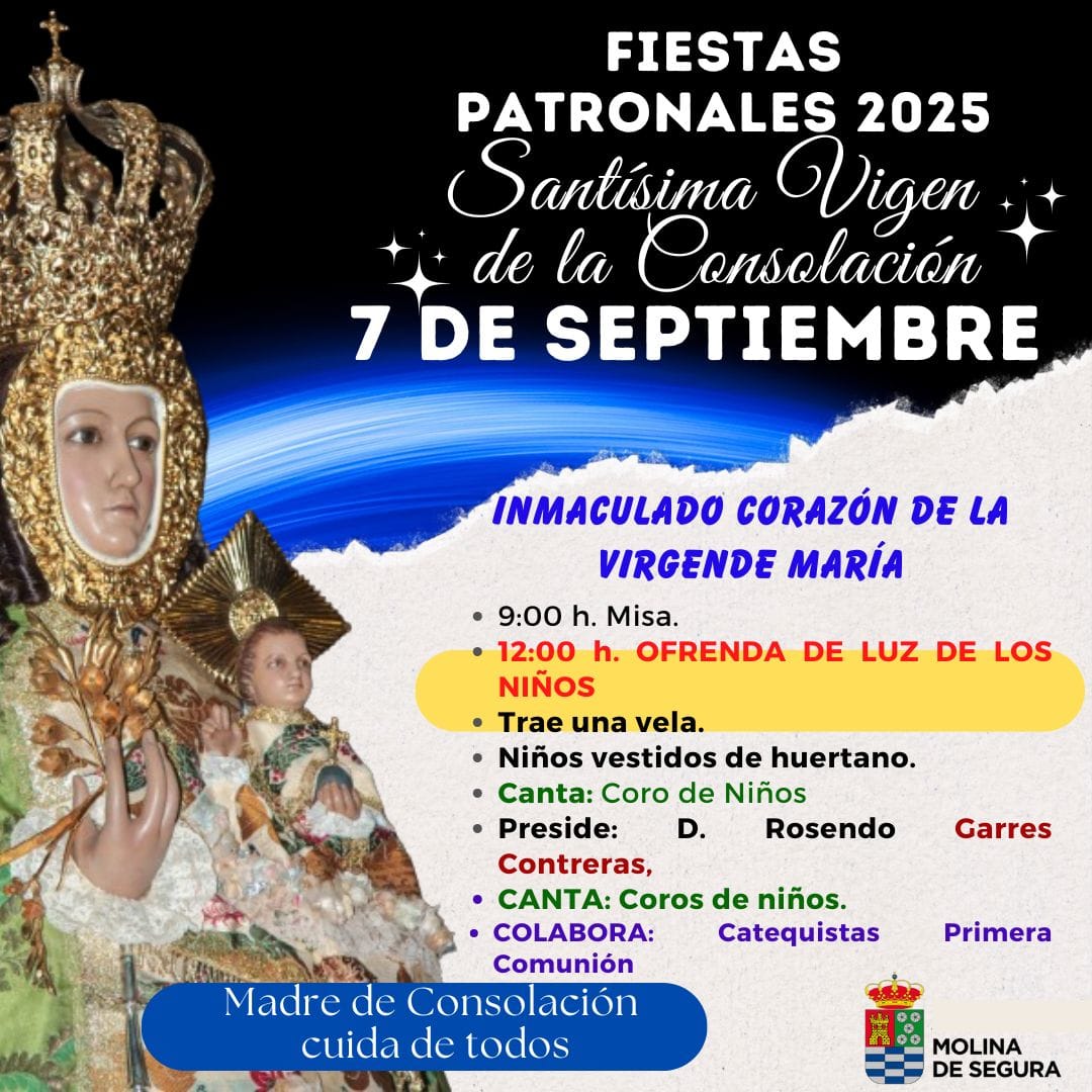 Invitamos a todos los niños de Molina de Segura a venir el domingo 7 de septiembre a honrar a nuestra Madre la Virgen de la Consolación.