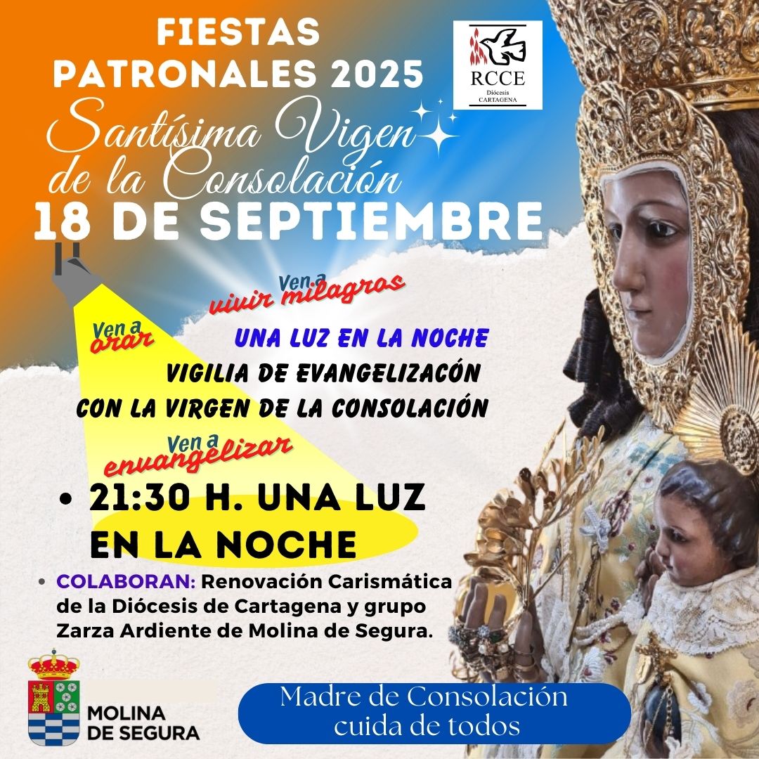 - 21:30 – 23:00 h. Oración de alabanza con la Virgen de la Consolación.