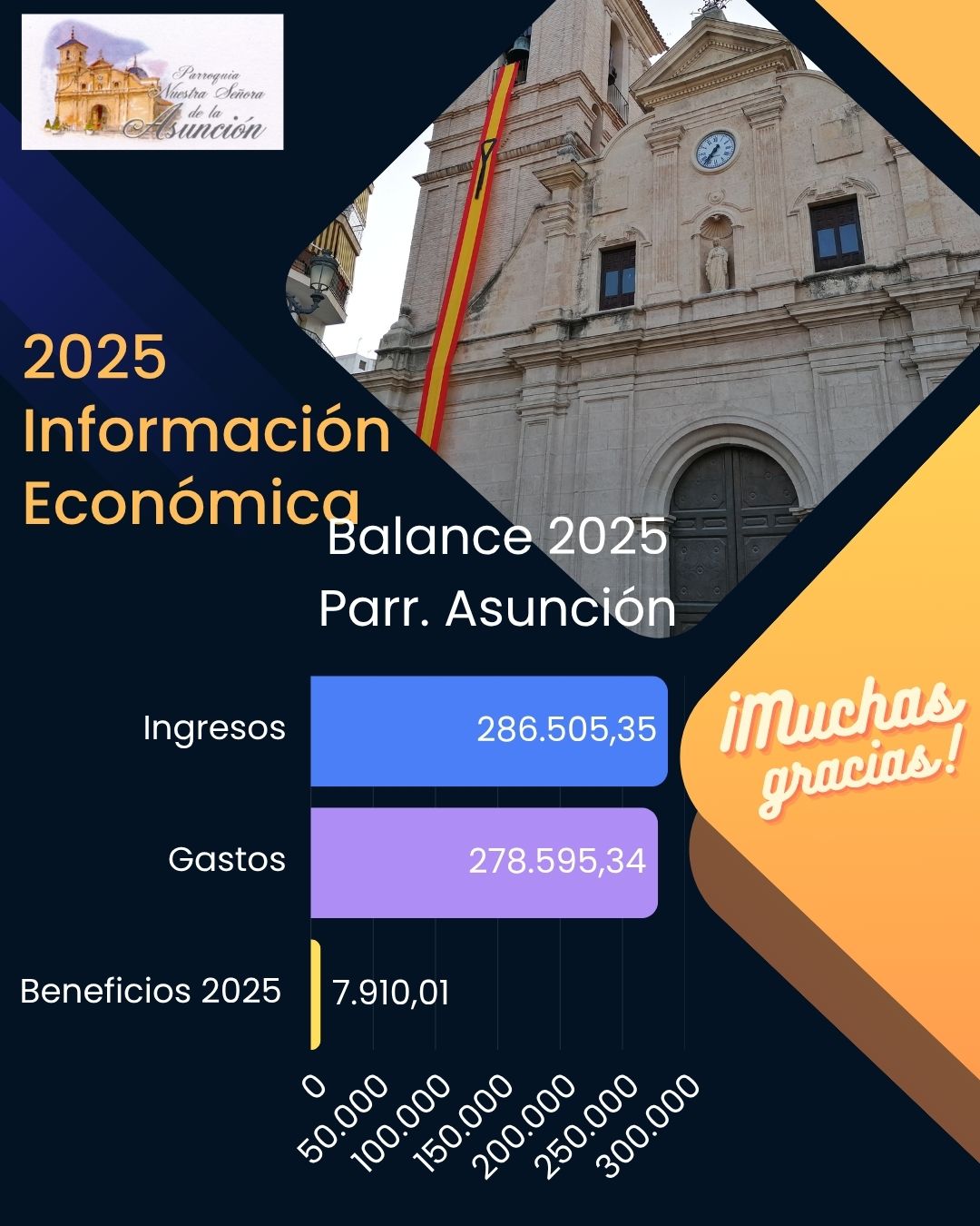 Con el espíritu de transparencia y corresponsabilidad que nos caracteriza como familia parroquial, compartimos con todos vosotros el balance económico correspondiente al pasado año 2025.