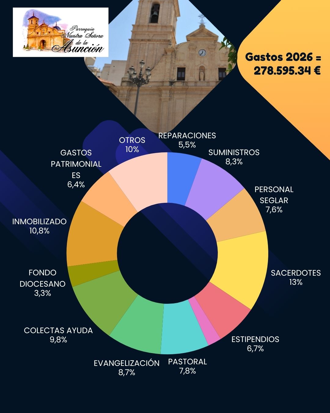 Gestionar con responsabilidad significa priorizar. En las imágenes 5 y 6 se detalla el destino de cada euro invertido por la parroquia.
