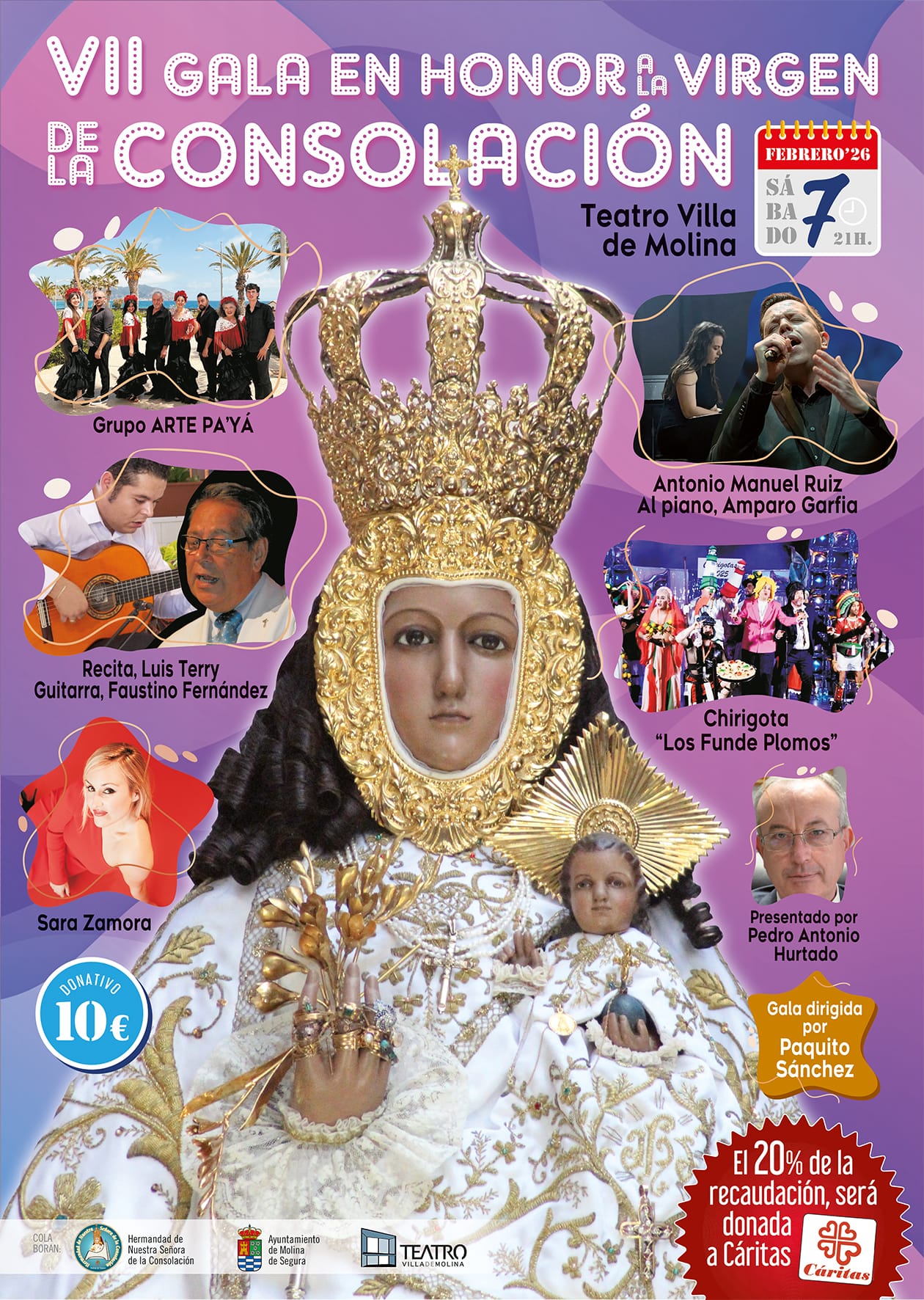 La gala fue organizada por la Hermandad de Nuestra Señora de la Consolación, con la colaboración del Ayuntamiento de Molina de Segura y el Teatro Villa de Molina, haciendo posible una noche en la que la fe, la cultura y la solidaridad se dieron la mano.